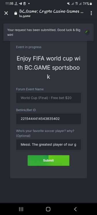 1. I've joined the forum event; Now it's your turn to win generous rewards from BC.GAME! Ticket ID : 2215444414543835402