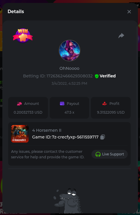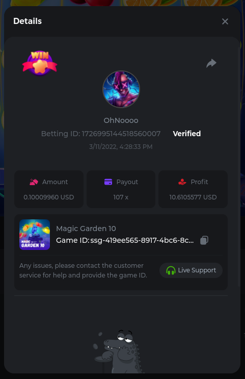 22. Golden Dancing Lion x 177.2 Betting ID: 1724947781266571904 Hit the Gold! x 44.8 Betting ID: 1724948222505448576 Tiger Jungle x 93 Betting ID: 1725143498319811079 Solar Queen x 47 Betting ID: 1725006049288958592